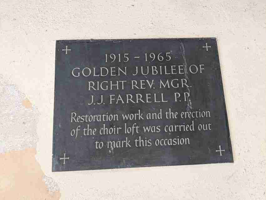 The base of the tower was originally open to its panelled ceiling, with a double-height moulded arch to the nave. A modern timber narthex structure was installed in 1965. Inside the tower a narthex extends into the glazed lobby below the organ loft. The tower interior has two empty canopied niches set high into the north and south walls at the height of the (liturgical) west window. Looking towards the painted panel ceiling which holds the bell chamber, there are two carved holy water stoups in the walls and plaques commemorating Canon Sheen (died 1937) and the restoration for the Golden Jubilee of the Rt Rev. Mgr JJ Farrell. The tall, narrow arch to the nave is mostly blocked by the pine panels of the organ loft. This 1965 intervention restricts the original intention of creating a vista towards the window.