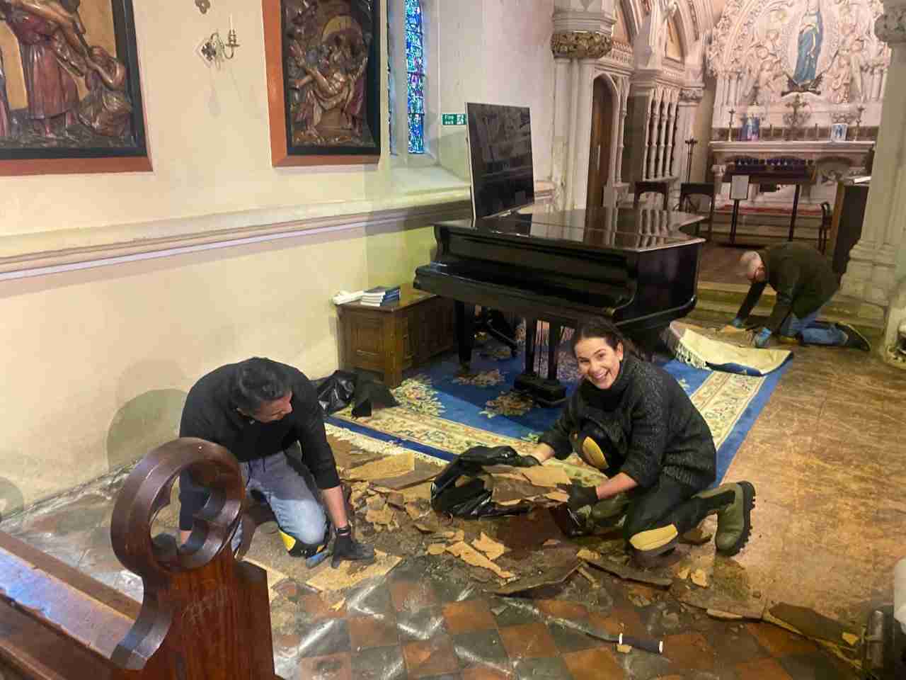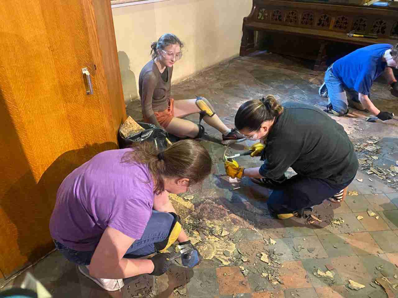 Removing cork flooring to reveal original Pugin floor tiles